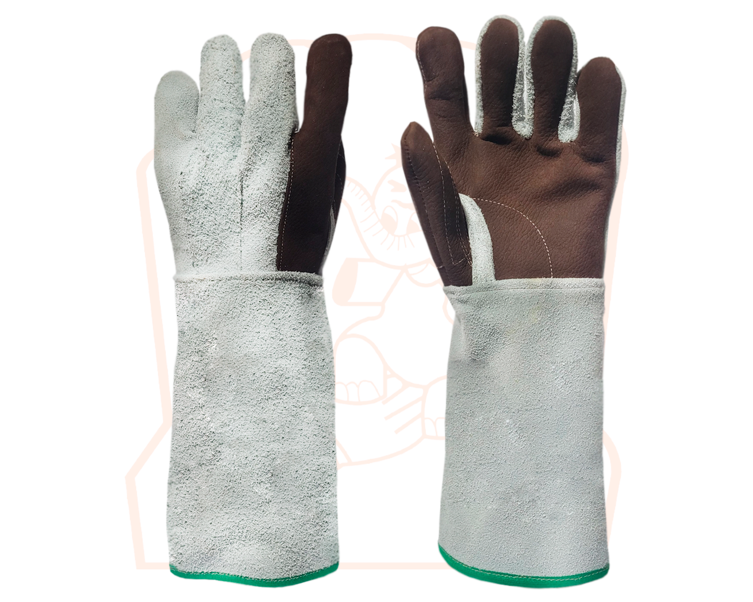 Guante fabricado con una combinación de piel en la palma y dedo índice, carnaza de res en el dorso. Piel de 1.8 mm de espesor curtido al cromo, lo cual hace que la piel resista al máximo de su capacidad en condiciones de abrasión y alta resistencia térmica. Refuerzo de doble palma completo. Largo total del guante 35cm.